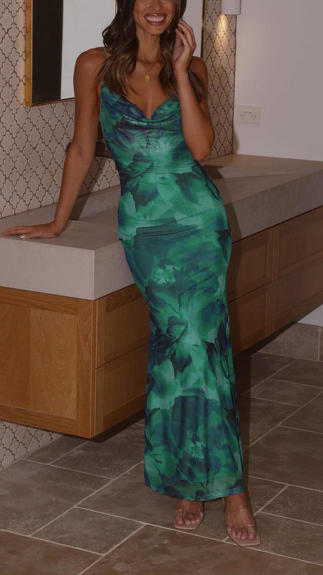 Toperth Grønn Blomstertrykt Spaghetti Straps Slip Maxi Dress